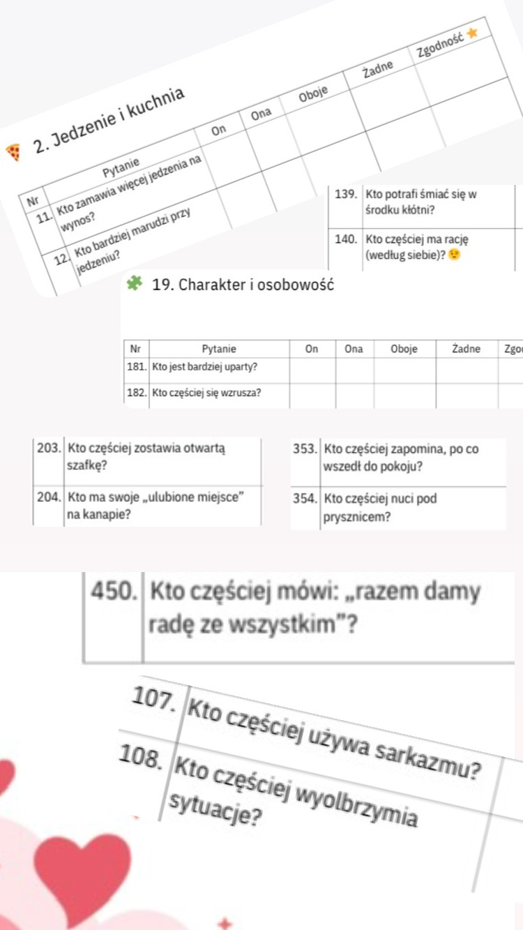 Podejdźcie do niego bez pośpiechu i bez stresu. Możecie robić go na raz, partiami, przy kawie, winie, spacerze… albo w łóżku udając, że macie ochotę na poważne rozmowy o 23:47. Niech to będzie zabawa, coś Waszego, coś, co może Was zbliżyć, rozśmieszyć, zaskoczyć — albo pomóc odkryć, jak pięknie potraficie się uzupełniać.