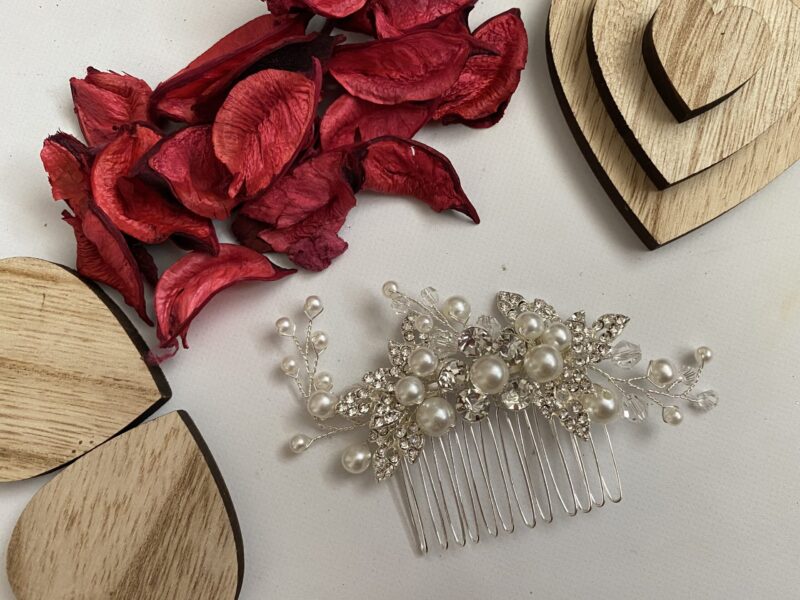 Elegancka ozdoba ślubna w formie grzebyku. Składa się ze ze srebrnych listków, kwiatuszków i kryształków, co idealnie ze sobą współgra.