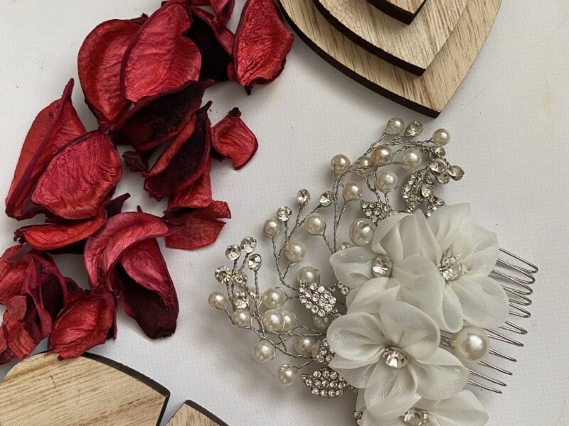 Elegancka ozdoba ślubna w formie grzebyku. Składa się z kwiatów w odcieniu ecru, delikatnych perełek i cyrkonii, co idealnie ze sobą współgra.