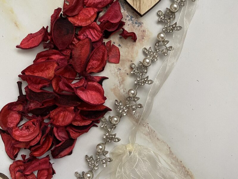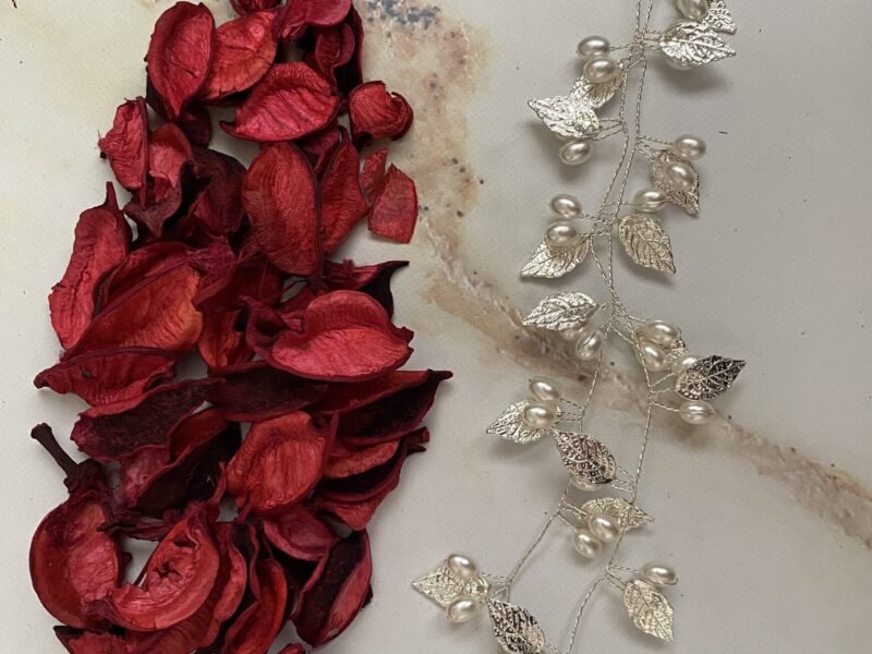Opaska ślubna w srebrnym kolorze z delikatnymi perełkami i listkami.