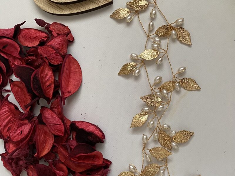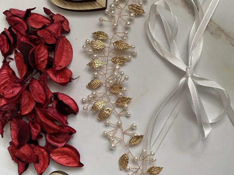 Opaska ślubna w kolorze złota z delikatnymi perełkami i listkami.