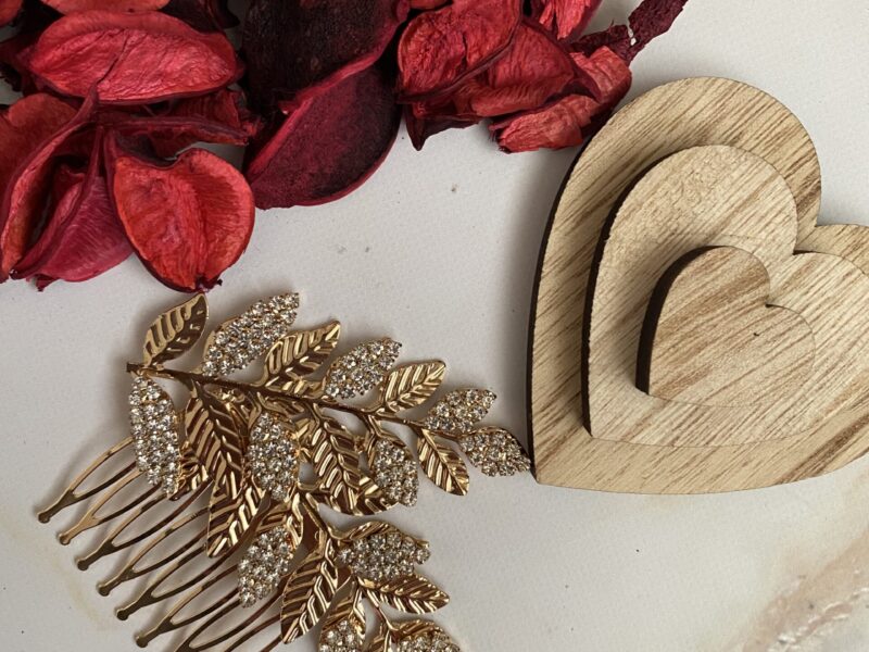 Elegancka ozdoba ślubna w formie grzebyku. Składa się ze złotych listków i kryształków, co idealnie ze sobą współgra.