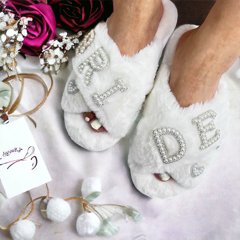 Piękne, białe kapcie ze ślubnym napisem BRIDE i małym serduszkiem. Sprawią, że już od samego poranka ten dzień będzie dla Was wyjątkowy, przepięknie będę się również prezentować podczas sesji zdjęciowej. Wykonane z miękkiego, wygodnego materiału, aby nogi w ciągu dnia mogły odpocząć przed całonocnymi tańcami.