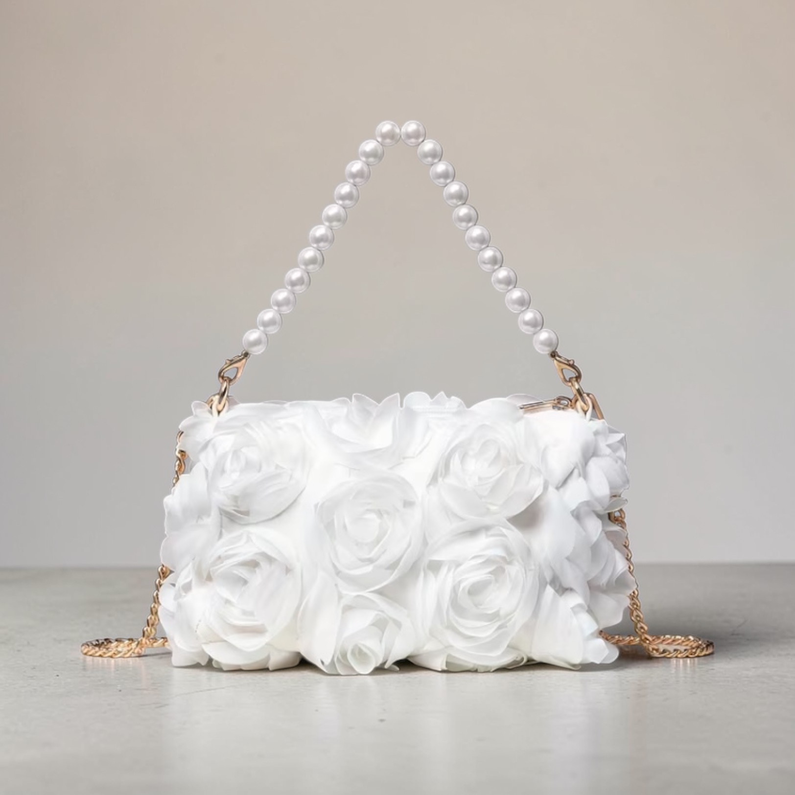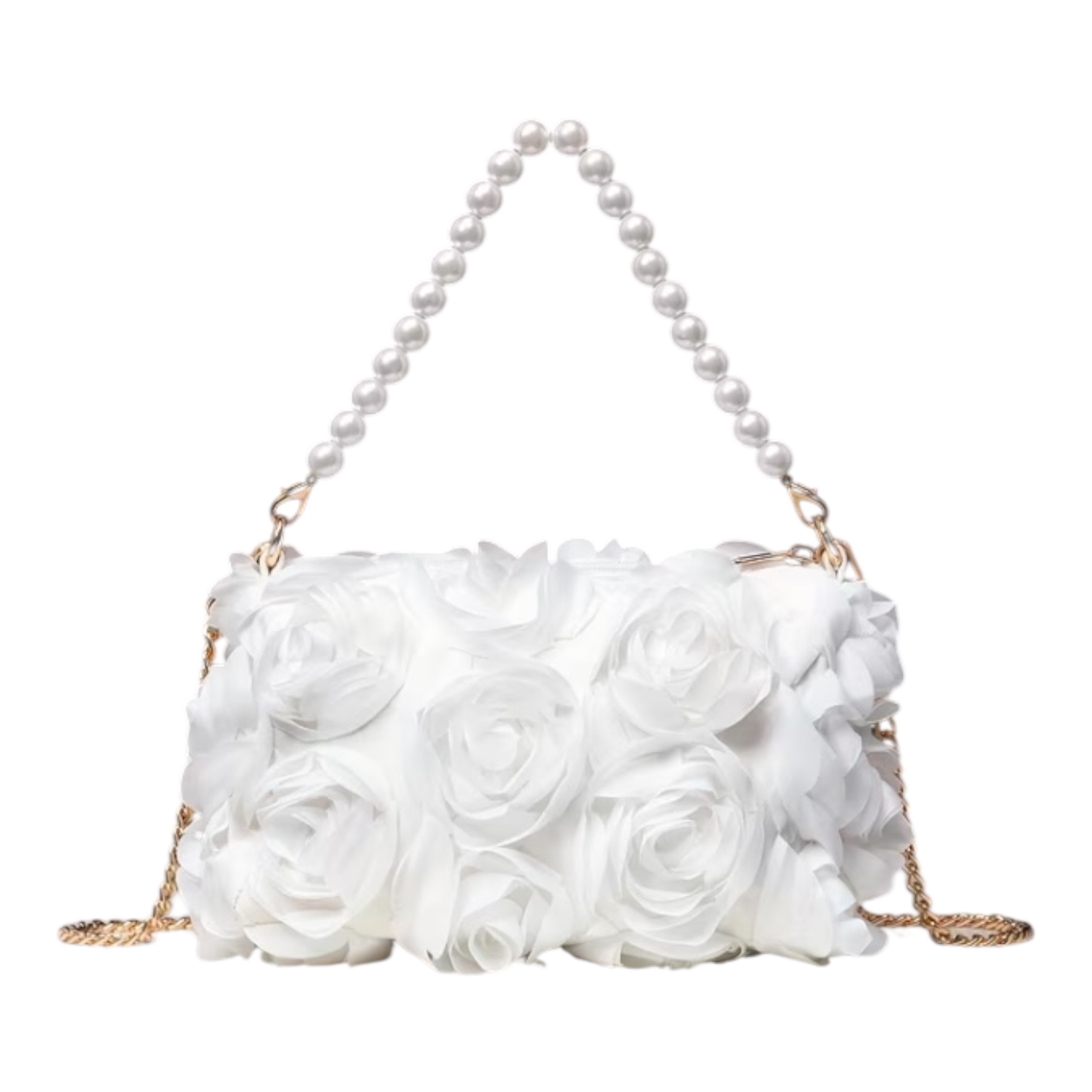 Elegancka biała torebka z różami, perłowym uchwytem i złotym łańcuszkiem