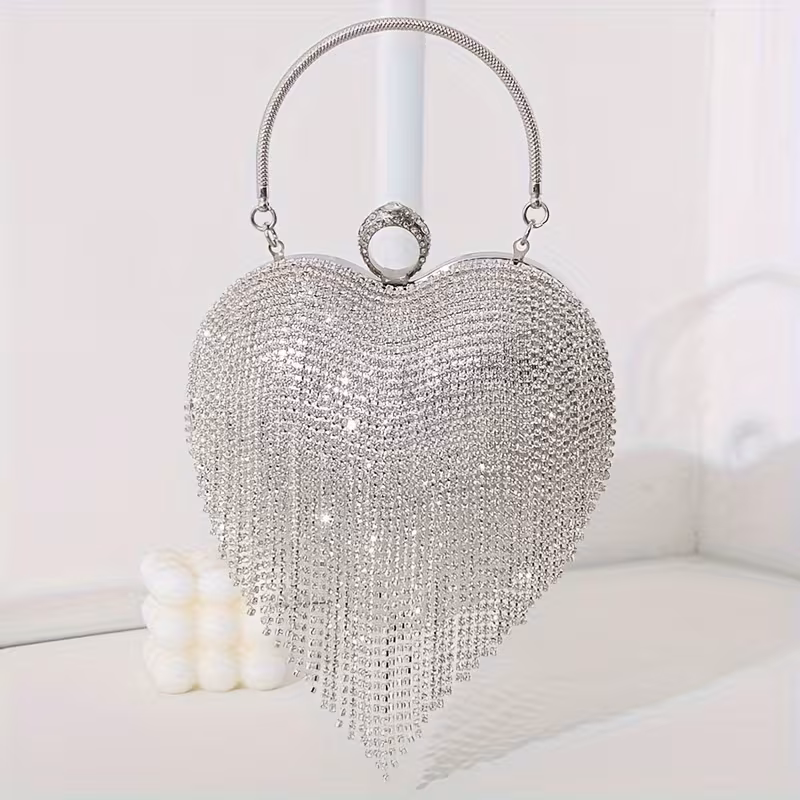Wyjątkowa torebka ślubna w kształcie serca, stworzona z myślą o Pannie Młodej, która pragnie dodać swojej stylizacji nuty luksusu i romantycznego blasku. Model zachwyca elegancką, biżuteryjną formą oraz misternym zdobieniem z połyskujących kryształków, które pięknie odbijają światło przy każdym ruchu.