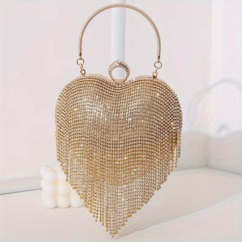 Torebka ślubna w kształcie serca – złota / srebrna, kryształowa z biżuteryjnym zapięciem
