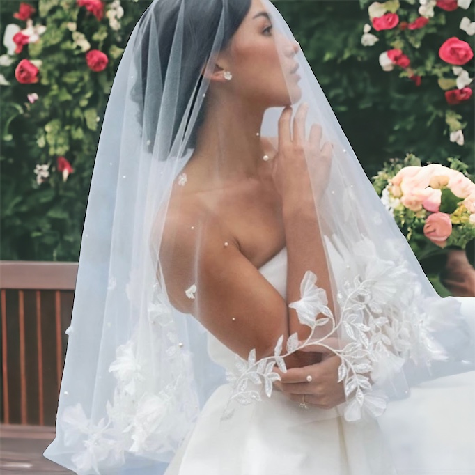 Welon zdobiony drobnymi perełkami, obszyty na końcach delikatnymi kwiatami. Idealnie skomponuje się z różnymi rodzajami sukni ślubnych od klasycznych krojów po księżniczki. Welon występuje w trzech odcieniach do wyboru: white, off white, ivory o wymiarach: przód 70cm, tył 90cm, szerokość 160cm. Nie ma problemu z jego zamocowaniem, które jest w formie grzebyku.