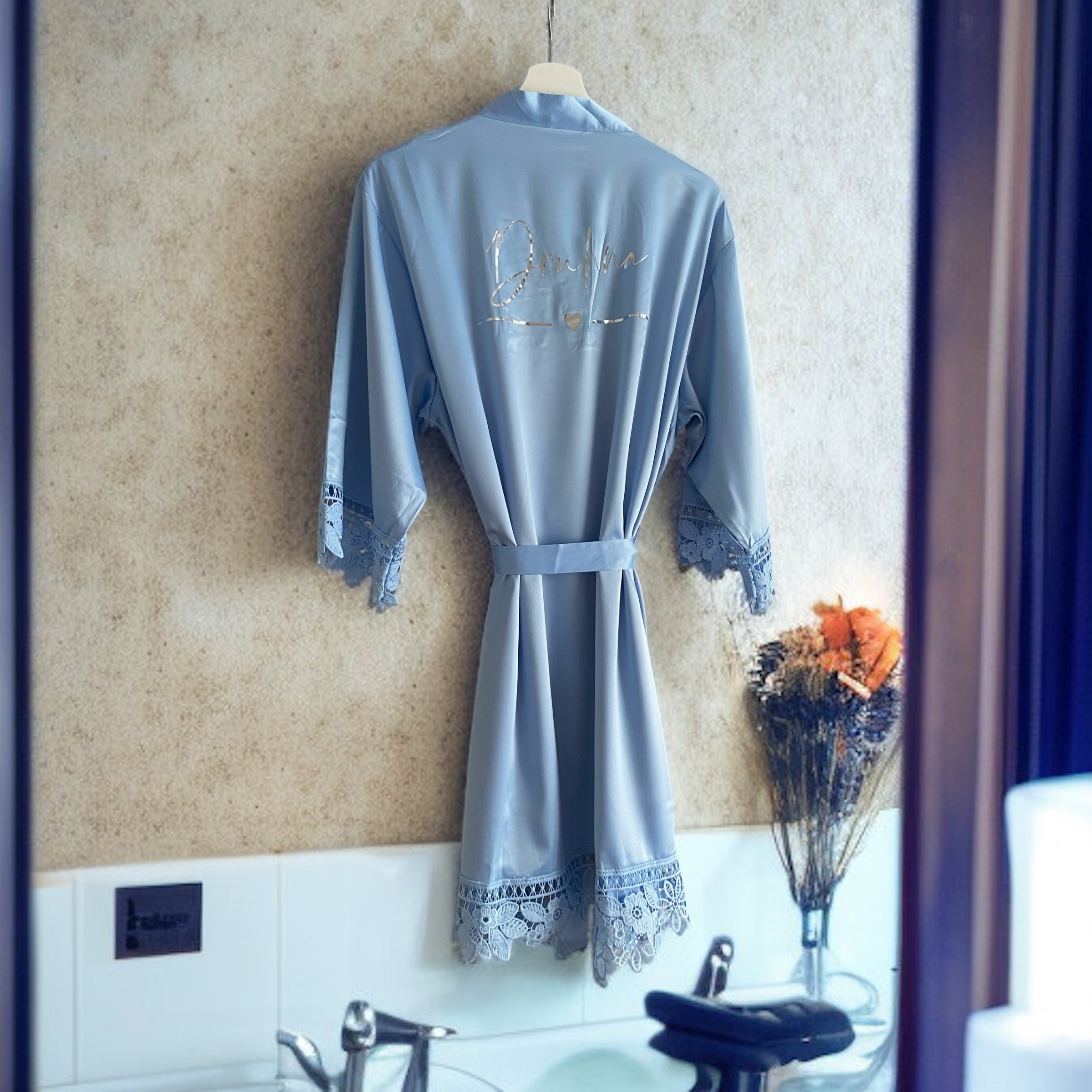 Piękny, satynowy szlafrok dla wyjątkowej Kobiety, jaką jest Druhna. Szlafrok poza błyszczącym, srebrnym napisem urzeka również efektowną koronką na obszyciach.