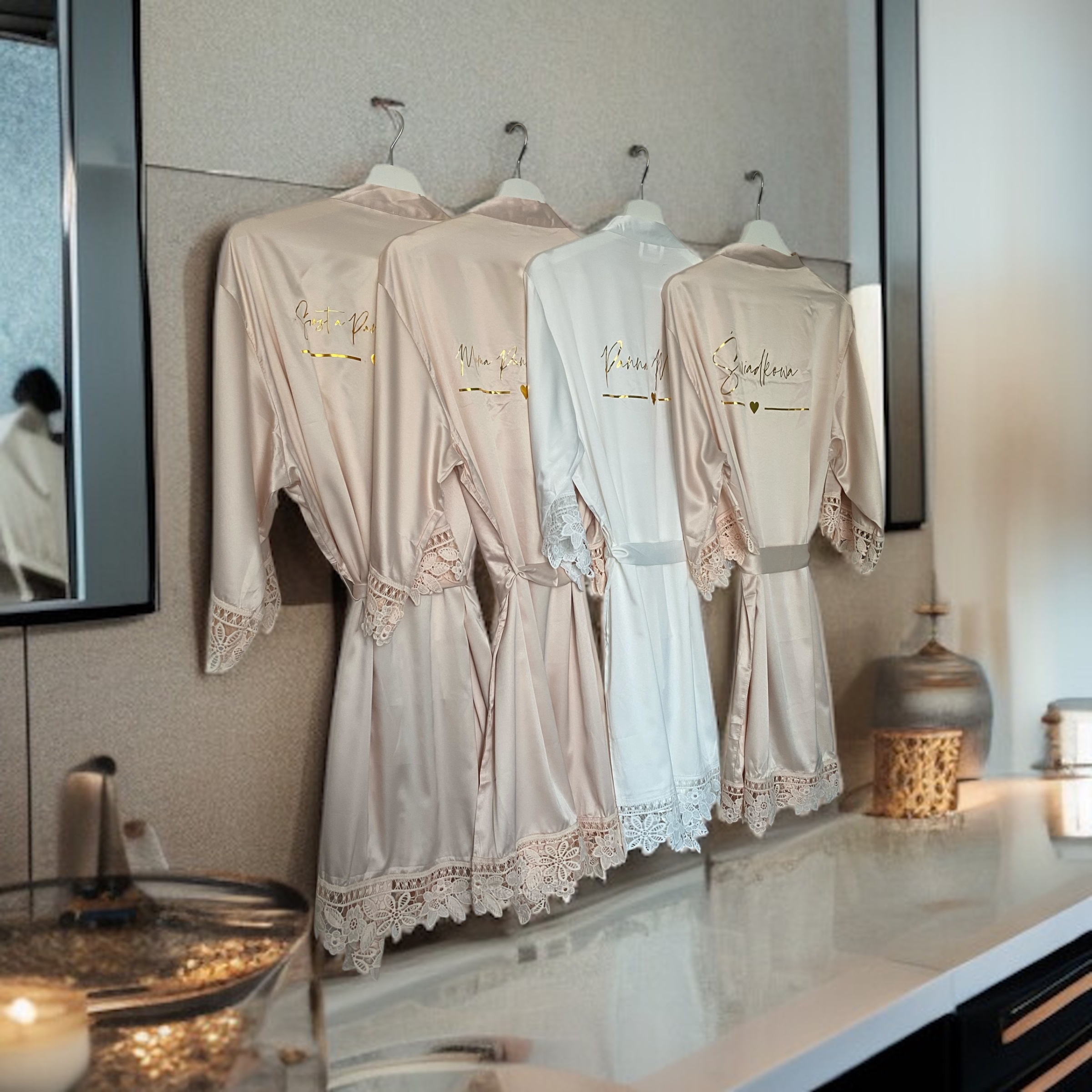 Piękne, satynowe szlafroki, które nadadzą elegancji w tym ważnym dla Was dniu. Poza błyszczącym, złotym napisem urzekają również efektowną koronką na obszyciach.