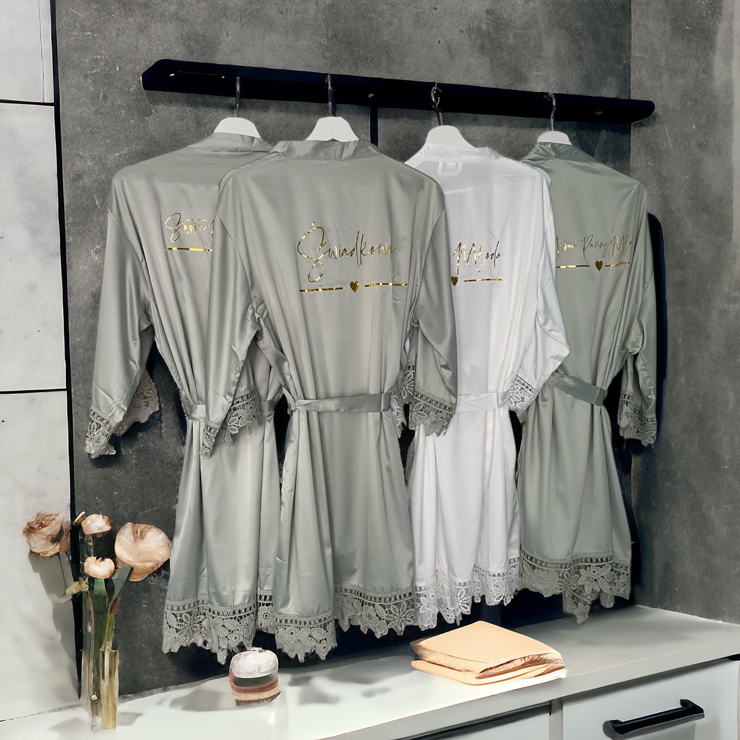 Piękne, satynowe szlafroki, które nadadzą elegancji w tym ważnym dla Was dniu. Poza błyszczącym, złotym napisem urzekają również efektowną koronką na obszyciach.
