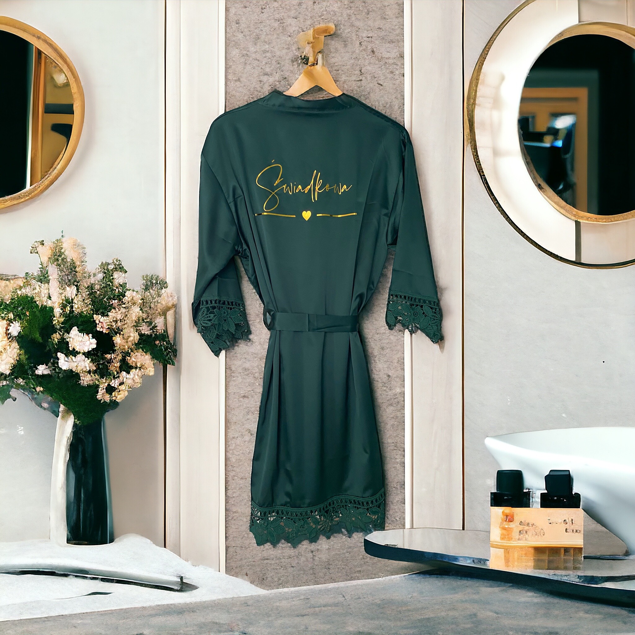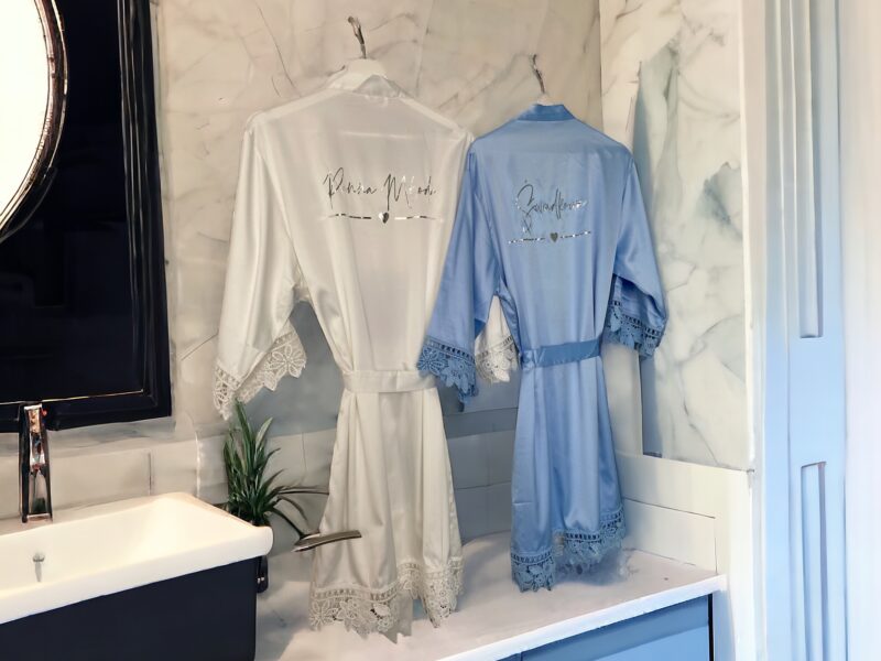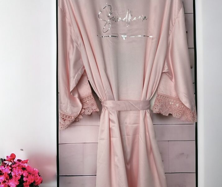 Piękne, satynowe szlafroki, które nadadzą elegancji w tym ważnym dla Was dniu. Poza błyszczącym, złotym napisem urzekają również efektowną koronką na obszyciach.