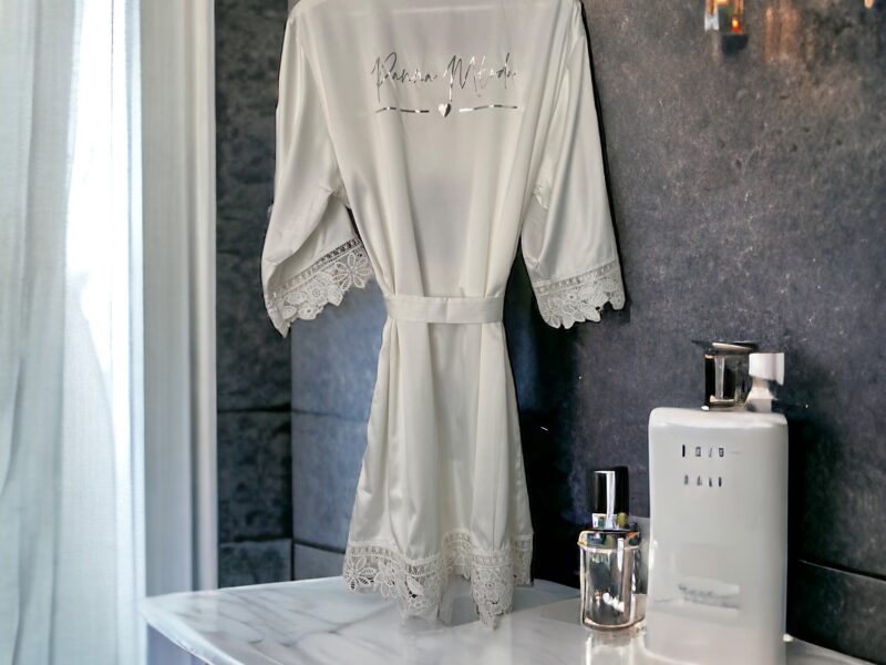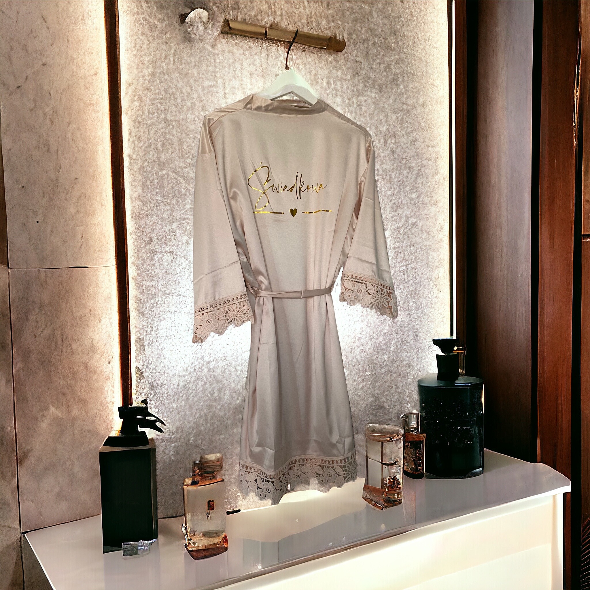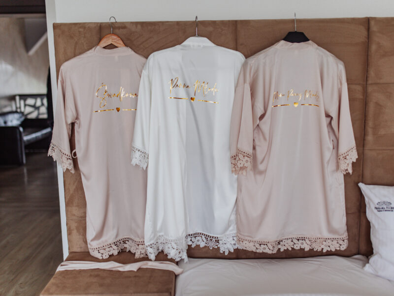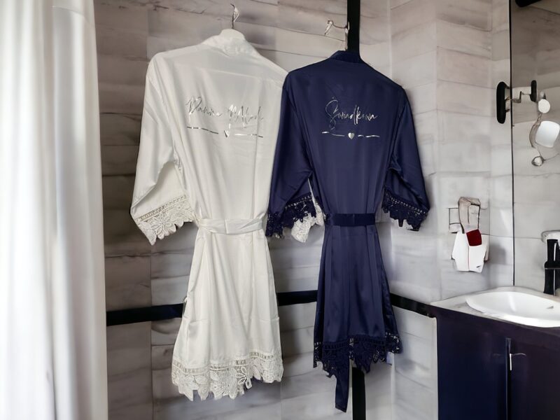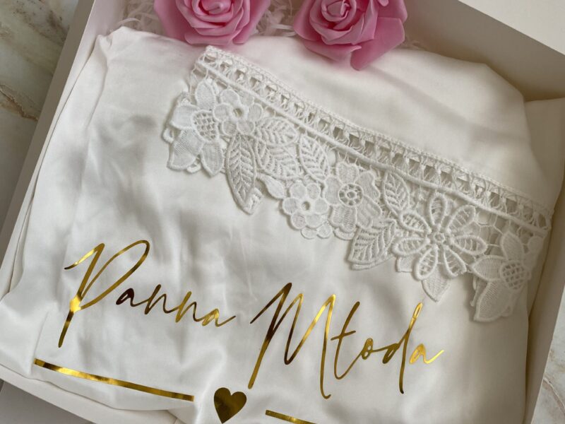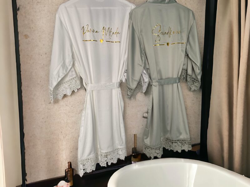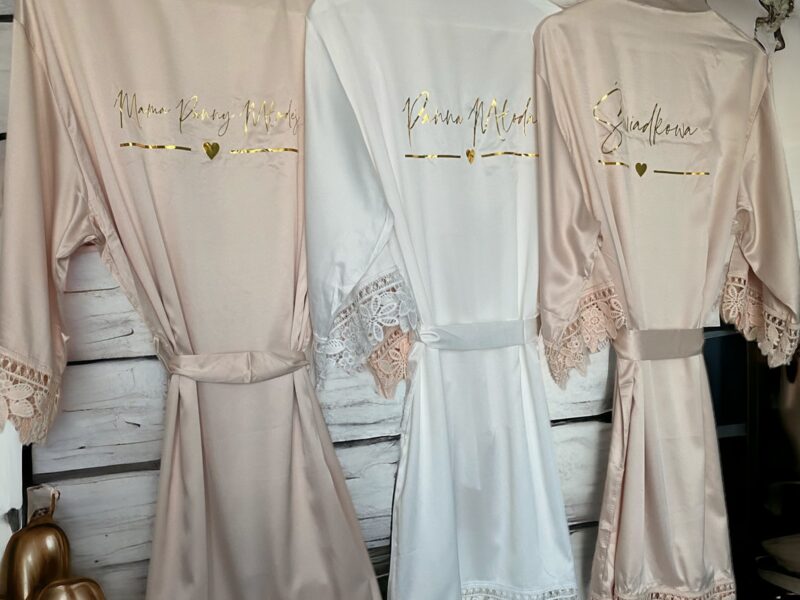 Piękne, satynowe szlafroki, które nadadzą elegancji w tym ważnym dla Was dniu. Poza błyszczącym, złotym napisem urzekają również efektowną koronką na obszyciach.