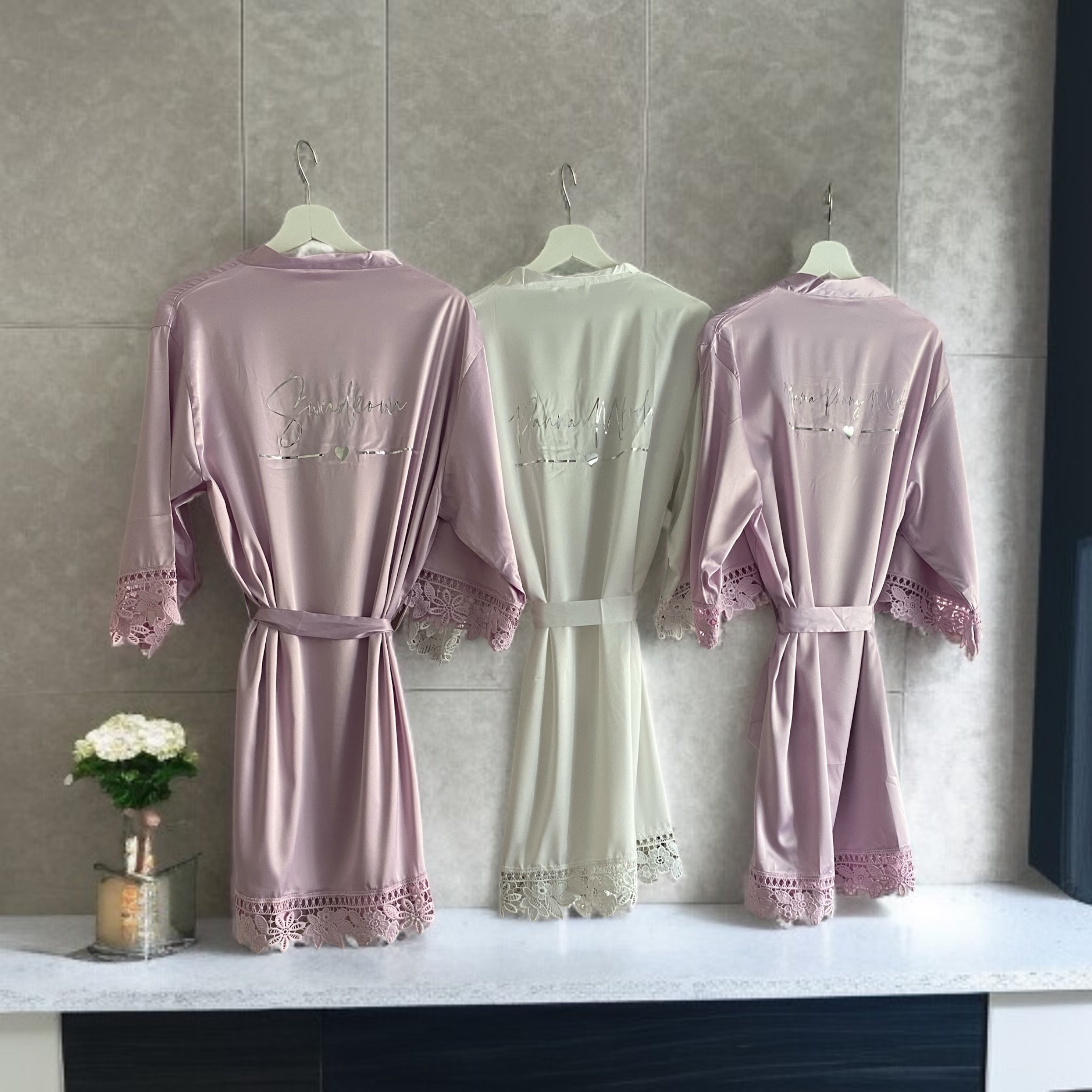 Piękne, satynowe szlafroki, które nadadzą elegancji w tym ważnym dla Was dniu. Poza błyszczącym, srebrnym napisem urzekają również efektowną koronką na obszyciach.